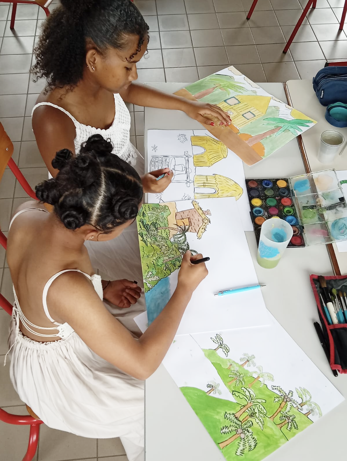 Matériel à disposition : Pinceaux, palettes aquarelles et livres de documentation.