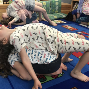 « yoga », en adaptant les personnages et le récit aux différentes postures. C’est le moment de lâcher prise et apprendre à canaliser son énergie. L’éveil des sens, le souffle, le rythme, le rapport à l’espace sont des outils importants utilisés lors de cette pratique. La fin de l’activité se fait en douceur avec la moralité de l’histoire. Ils sont enfin guidés vers une relaxation en musique et le chant d’un petit mantra pour clôturer la séance.